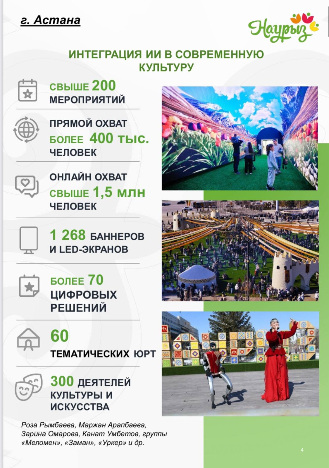 Таким образом, праздничные мероприятия в Астане продемонстрировали новый подход к организации Наурыза, где национальные традиции гармонично сочетаются с инновациями и цифровыми решениями, открывая новые возможности для развития культурных инициатив.