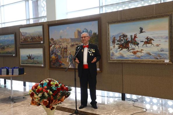 Мұнан соң сөз алған Түркістан облыстық мәдениет басқармасының басшысы Әзімхан Қойлыбаев суретшіге облыс әкімі Өмірзақ Естайұлының алғыс хатын салтанатты түрде табыс етіп, шығармашылық табыс тіледі.