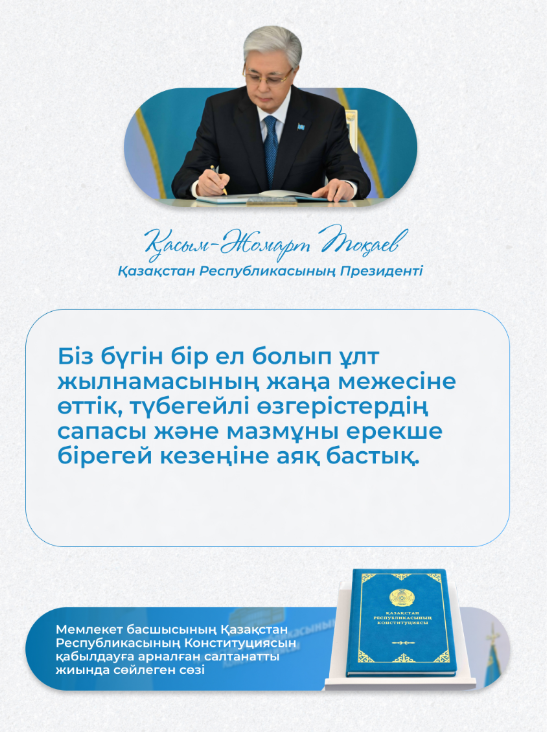 Басты ақпаратМемлекет басшысының Қазақстан Республикасының Конституциясын қабылдауға арналған салтанатты жиында сөйлеген сөзі 18.03.20268 Мемлекет басшысының Қазақстан Республикасының Конституциясын қабылдауға арналған салтанатты жиында сөйлеген сөзі