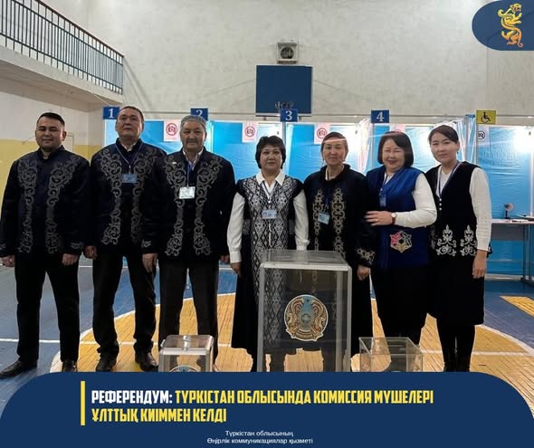 Түркістан облысында референдум учаскелері таңғы 07:00-ден өз жұмысын бастады. Учаскелік сайлау комиссиясының мүшелері ұлттық нақыштағы киімдер киіп, сайлаушыларды жылы қарсы алуда. Олардың айтуынша, наурызнаманың онкүндігіне тура келген саяси маңызы жоғары шараны ұлттық киіммен өткізу патриоттылықтың көрінісі.