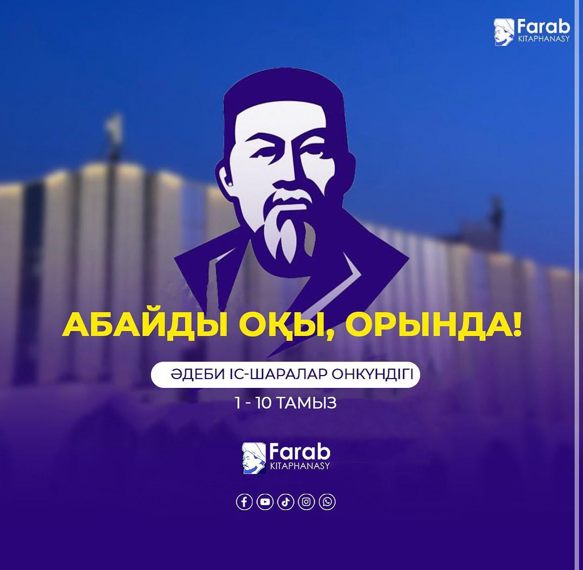 Түркістан облыстық «Фараб» әмбебап ғылыми кітапханасында Абай күні қарсаңында әдеби іс-шаралар онкүндігі ұйымдастырылуда. «АБАЙДЫ ОҚЫ, ОРЫНДА!» атты онкүндіктің бағдарламасы: