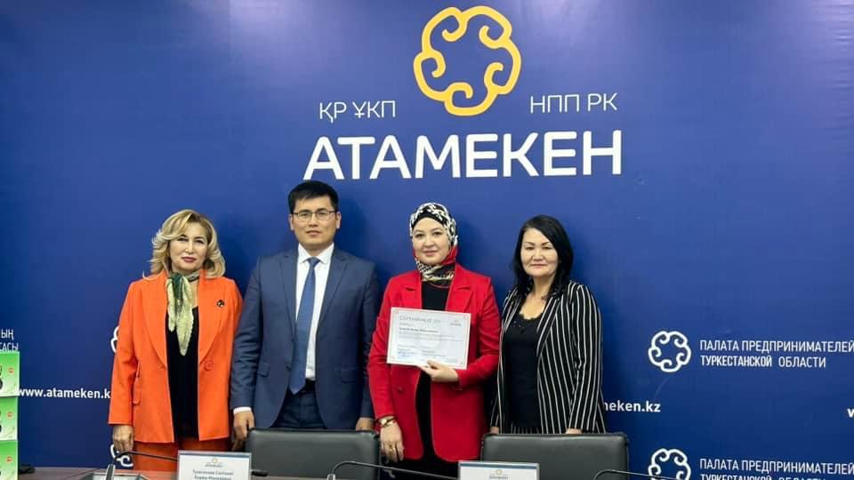 Түркістан облысының кәсіпкерлер палатасы алаңында тәлімгерлік бағдарламасынан өткен 12 кәсіпкерге сертификат табысталды. Марапаттау шарасына Түркістан облысы кәсіпкерлер палатасының директорының орынбасары Ербол Әуелбеков пен Түркістан облысы Іскер әйелдер кеңесінің мүшесі, әйелдер кәсіпкерлігін дамыту орталығының тәлімгері Салтанат Төлегенова қатысты.