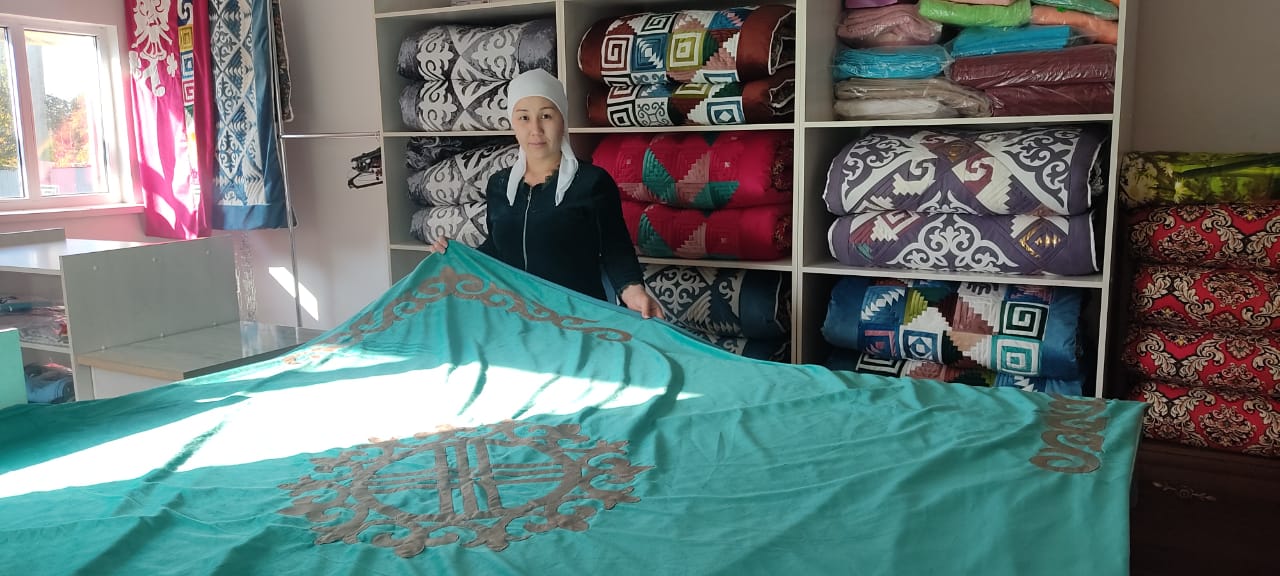 Мұнан алдын әкімдіктің қолдауымен ауылдық мәдениет үйінің бір бөлмесін алып, тапсырыстарын табысты орындап жүрген апасы мен келіні үй алдындағы цехқа ауысады. Цехта 5 маман жұмыс жасайды. Барлығы да он саусағынан бал тамған ауылдың келіншектері. Үлкен көрпе мен көрпешелерді тігу мен қабу сияқты жұмыстарда бірінің ойын бірі қолдап, жаңа идеяларын ортаға салып, әдемі бұйымдар шығарып отырған аяулы жандар. Енесінің ісін құптап, кәсібінің ары қарай гүлденуіне атсалысып жүрген келіні Ақбота Сақтағанова да осы саланы жетік меңгерген маман. Ол сондай-ақ мемлекеттік бағдарламаларға қатысып, кәсіпке қатысты құжаттарды реттеп, шаруаны тап-тұйнақтай тындырып отырған ауыл-аймақтың бетке тұтар келіні.