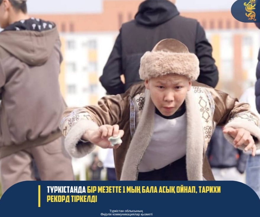 Наурызнаманың онкүндігі аясындағы «Ұлттық спорт» күні қарсаңында Түркістанда тарихи нәтиже тіркелді. Бір мезетте 1 мыңнан астам бала асық ойнап, Қазақстанның «КИнЭС» рекордтар кітабына енді.